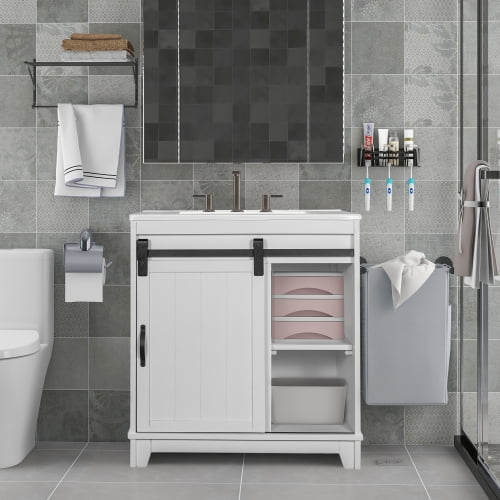Free-Standing Bathroom Vanity with Sliding Bars Door and White Sink, Vanity Sink Combo, Storage Vanity Cabinet, Bathroom Sink, Fully assembled except